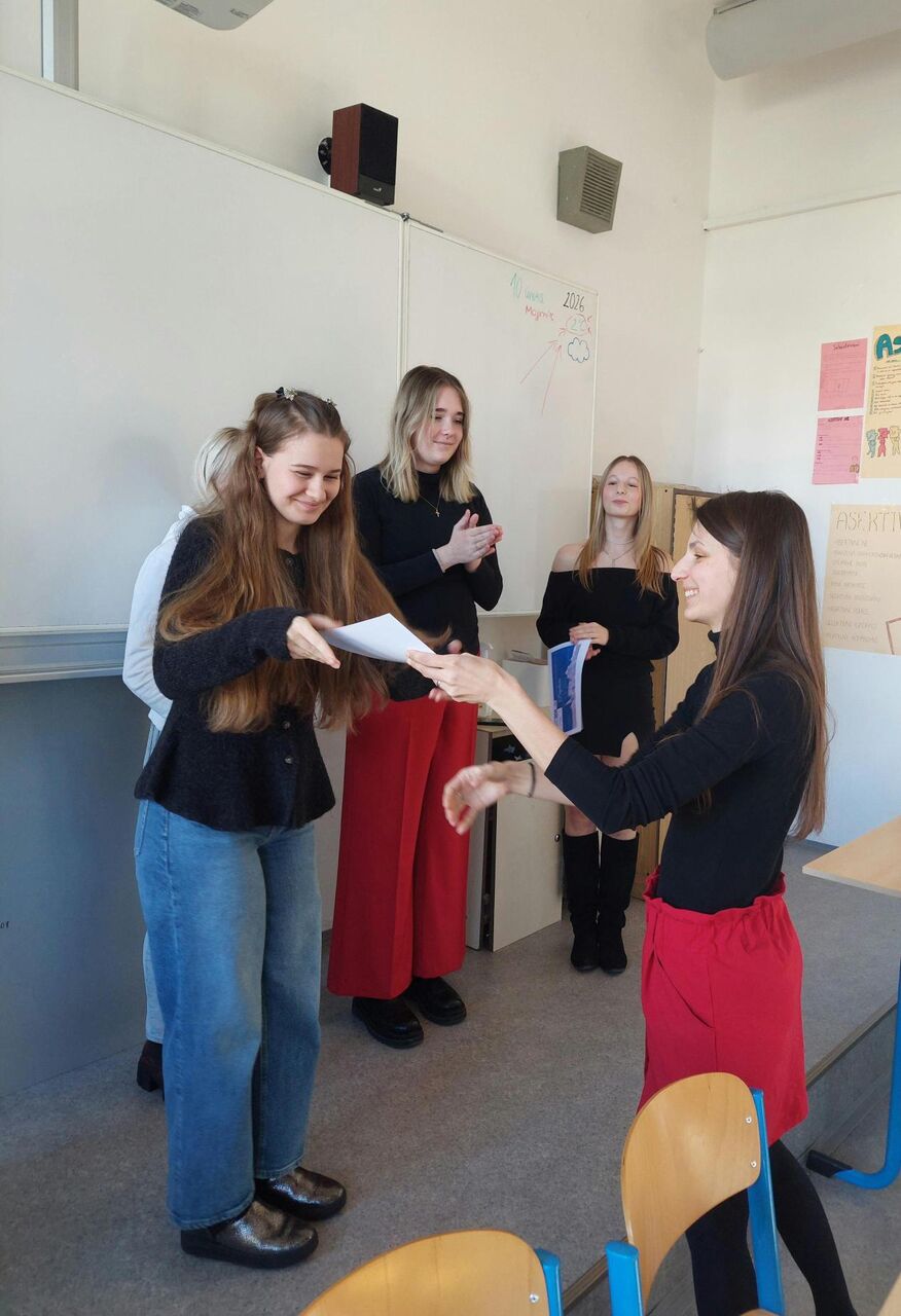 Soutěžící nejprve absolvovaly písemnou část, ze které pět nejlepších postoupilo k ústním pohovorům. V úterý 10. února 2026 musely před komisí pohovořit na vylosované téma a popsat zadaný obrázek. Karolína Králová a Kristýna Porynecová budou naši školu reprezentovat v krajském kole. Jejich náhradnicí je Linda Anderlová, která obsadila třetí místo. Všem děkujeme za účast a postupujícím přejeme hodně štěstí!